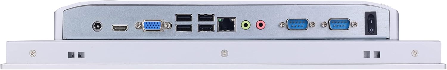 This industrial panel pc with DC12V*1/HDMI*1/VGA*1/LAN*1/USB2.0*4/AUDIO*2/COM*2, support automatically power on after power failure, with mounting embedded buckle kits